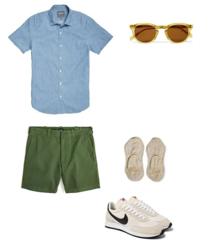 - Chino shorts + short-sleeve button-up for a refined casual look